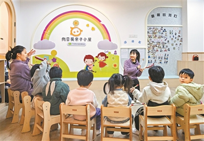 托育园老师带领小朋友玩游戏。广州日报全媒体记者廖雪明 摄