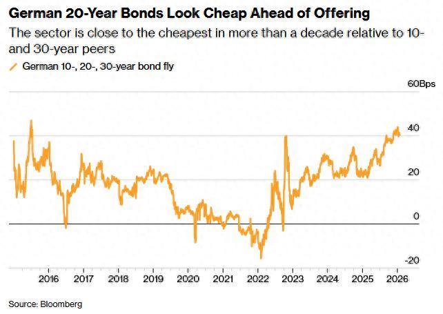 德国20年期国债收益率目前徘徊在3.38%左右,接近上月触及的14年高点。与10年期和30年期债券相比,其价格接近十多年来的最低水平,这可能吸引投资者。本世纪以来,德国曾偶尔发售过这种期限的债券,但那些债券最初设定的期限更长,随后随着时间的推移而缩短至20年。
