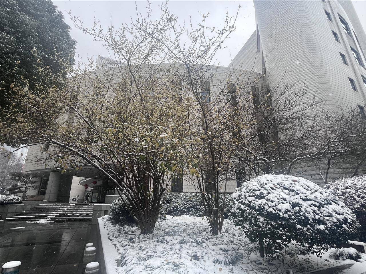 武汉图书馆门口的梅花,在雪中散发芬芳,工作人员正忙着铲雪,给读者开出一条好走的道。