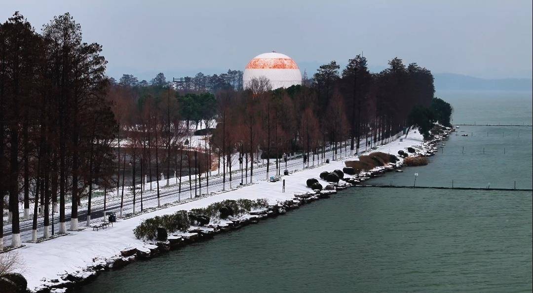 白雪为东湖织就了一条绒毯,沿湖的水杉静静伫立,远处的建筑在雪色里若隐若现,这方人民乐园,此刻满是冬日限定的诗意。
