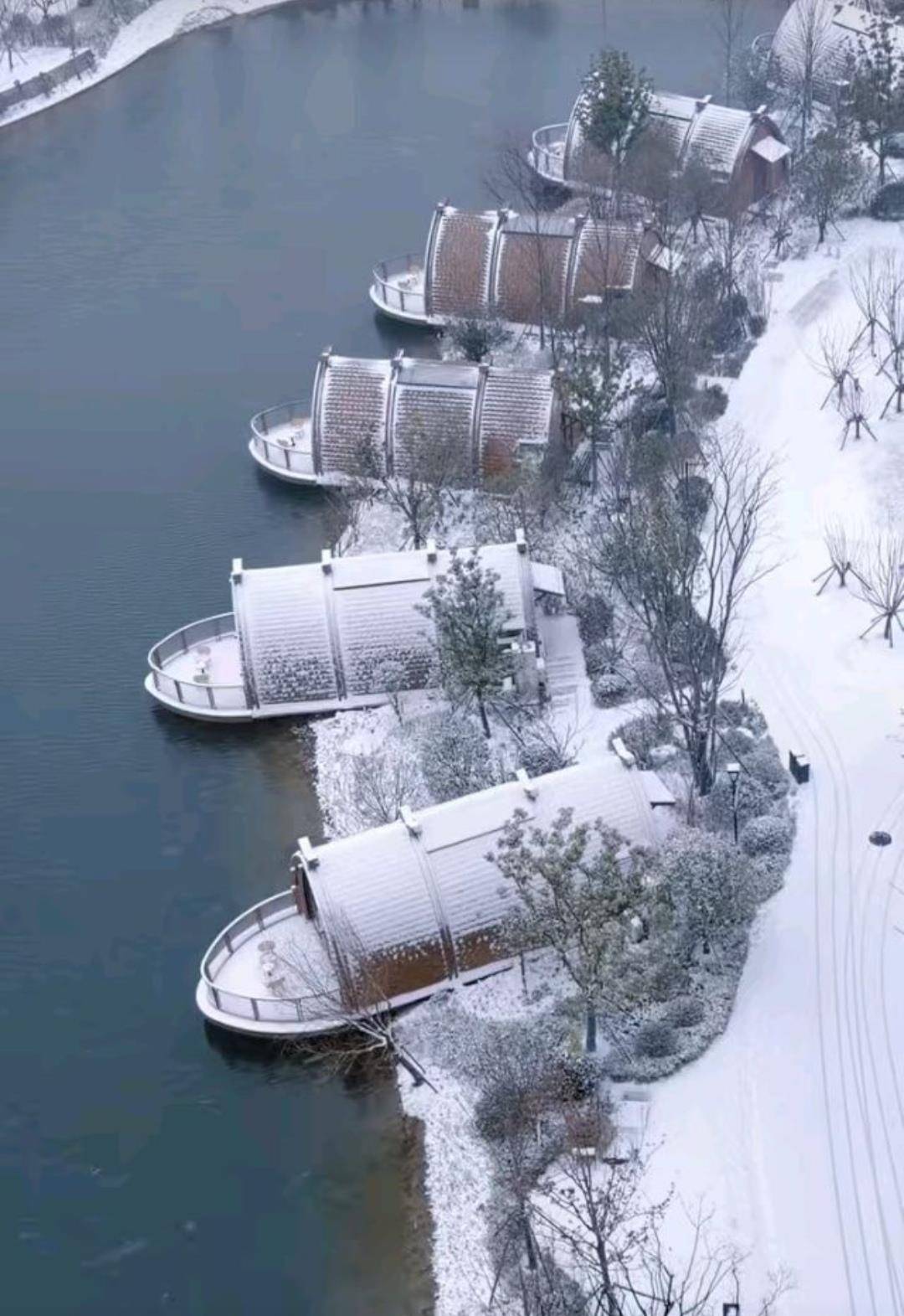 雪落在武汉城建开元森泊,船屋静静泊在湖面,银装素裹间仿佛闯入了冬日童话。彩色城堡也换上了雪白绒毯,清冷的水汽里满是温柔的治愈感。