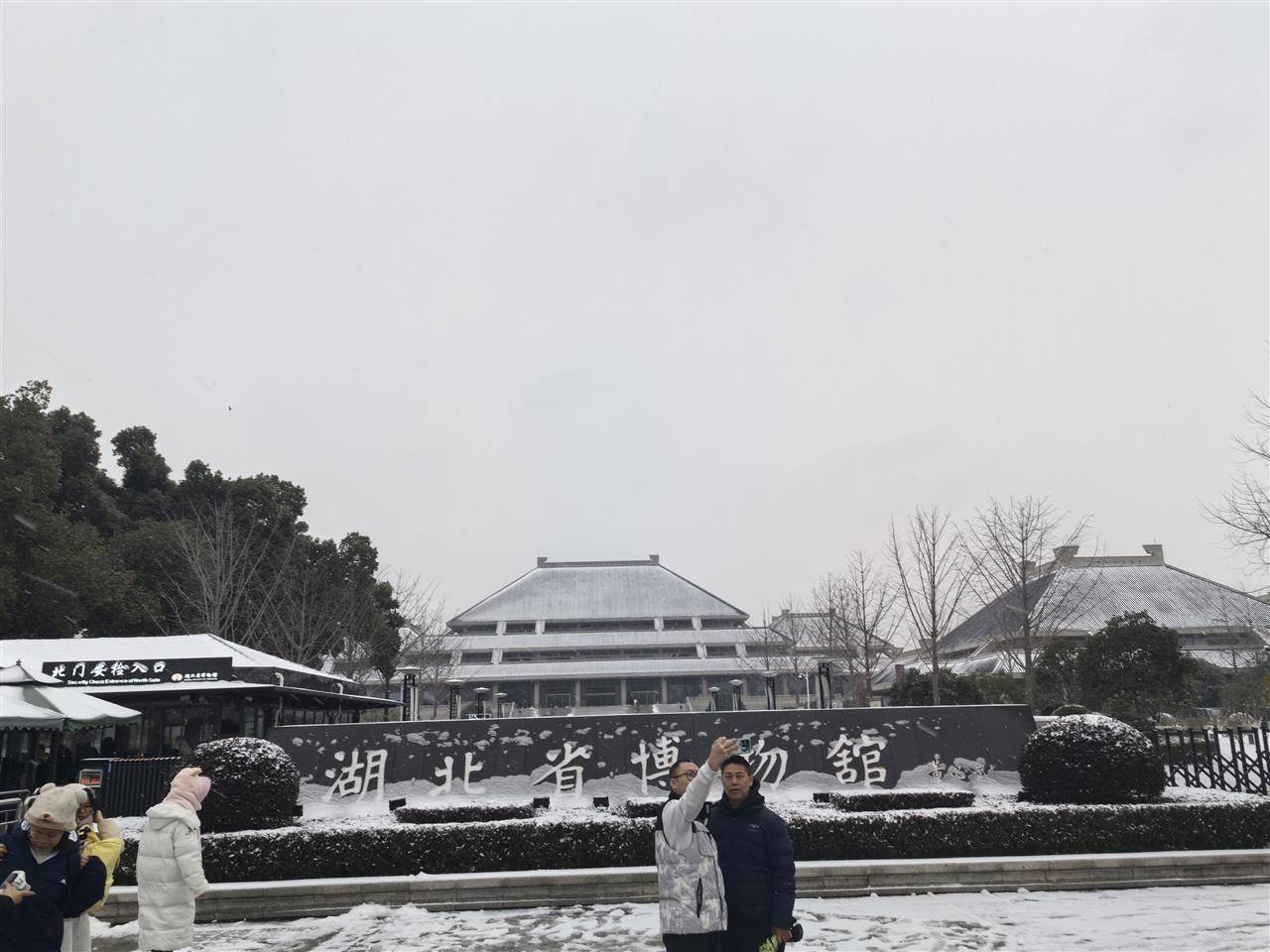 湖北省博物馆门口,一大早就有游客在雪中与博物馆合影。