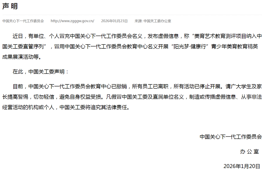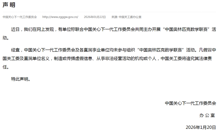 1月20日,中国关心下一代工作委员会(简称“中国关工委”)官网发布一则声明称:从未主办、支持或参与名为“中国奥林匹克数学联赛”的赛事,所有宣称与此相关的活动均属冒用名义。三天后,该机构再次发声,指出另有机构假借已撤销的“中国关工委教育中心”名义,组织“阳光梦·健康行”美育展演活动。连续两次无奈的辟谣,背后矛头直指同一类现象——以权威机构之名,行敛财之实的“山寨竞赛”。